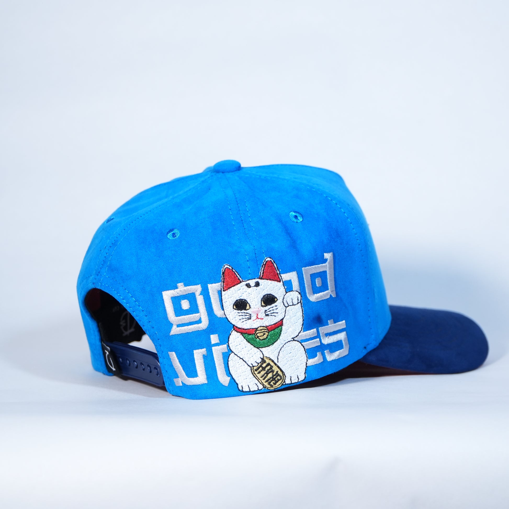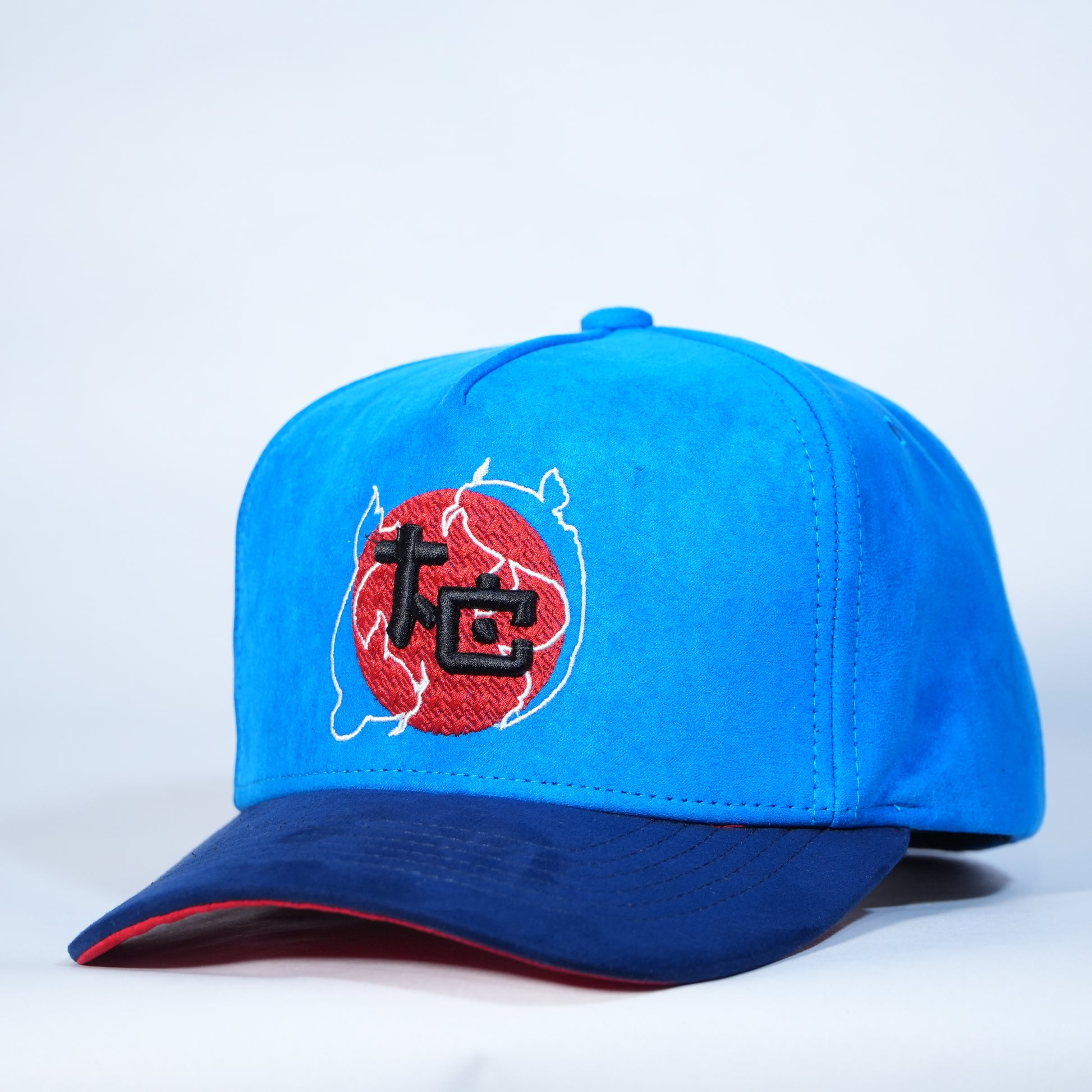 Gorra full gamuza en tonos azul cielo y azul marino, con visera baja en color rojo que aporta un contraste audaz. Su diseño de inspiración oriental le da un estilo único, llamativo y lleno de carácter.